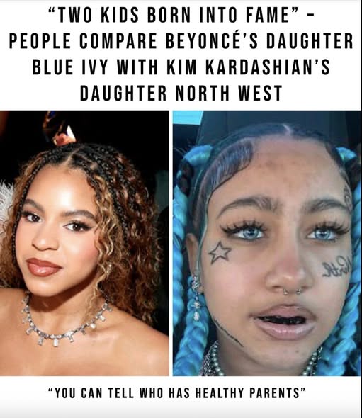 The post contrasted a natural photo of Blue Ivy with images of North in a stylized look featuring piercings and dental grills, often mistaken by some as real.