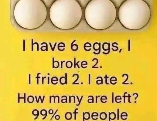 “I have six eggs. I broke two. I fried two. I ate two. How many are left?”