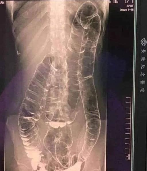 When waste accumulates in the colon due to an inefficient digestive system, it causes severe discomfort and bloating. Over time, the colon expands beyond its normal size, struggling to contain the excessive buildup of feces. In this case, medical imaging revealed a severely distended colon that had enlarged so much it reached up toward the chest, dangerously close to the heart. The stretching had nearly erased the colon’s natural folds and wrinkles, essential for its proper function. Left untreated, this condition could have led to life-threatening complications.