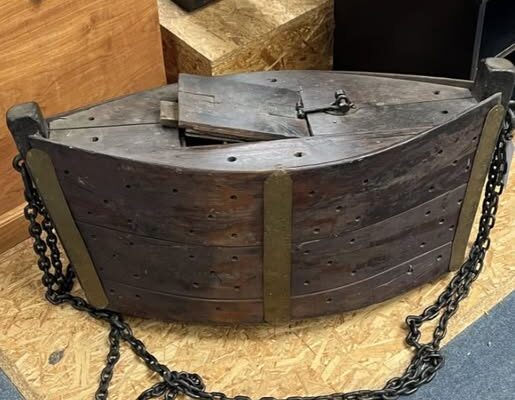 Shaped to hug the current, this antique fish-holding apparatus turned wild rivers into living pantries. Fishermen slid their wriggling catch through the latched lid, then chained the heavy box to rocks or roots, trusting the cold flow to keep their food alive and fresh. The perforated wooden slats let water stream through, renewing oxygen, washing away waste, and turning a crude container into a quiet, efficient life-support system.