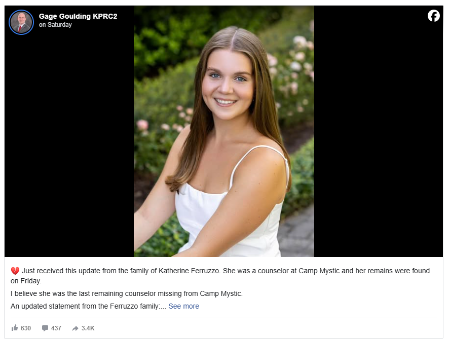 On July 11, authorities officially confirmed that Katherine Ferruzzo, a vibrant young counselor and recent high school graduate, was among the victims of the flood. Her remains were recovered after an extensive search effort led by Texas Rangers, first responders, and community volunteers.
