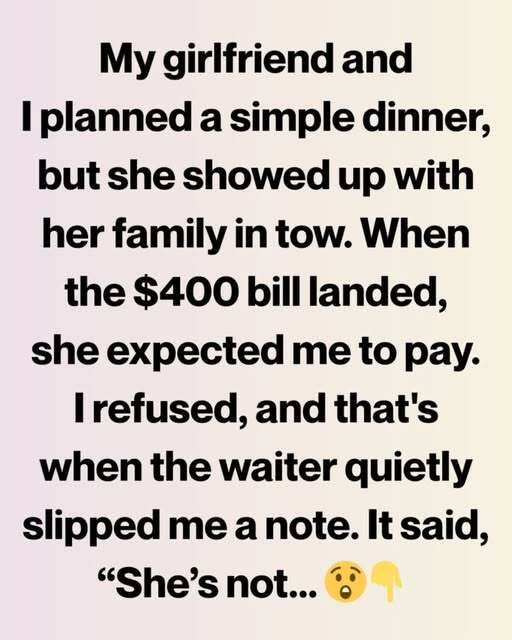 The evening arrived, and my expectations were immediately upended. A long table stretched across the restaurant, filled with her extended family. Every head turned toward me at once, creating a theatrical, rather than welcoming, atmosphere. Introductions were absent, conversation excluded me, and orders flowed without consultation—premium seafood, expensive cuts of meat, multiple appetizers, bottles of wine, desserts discussed before starters. My discomfort grew, but she remained unfazed. When the bill arrived—four hundred dollars—her expectation that I cover it was clear. Hesitation drew her irritation, and her relatives watched silently. At that moment, I realized the dinner was never about connection; it was about obligation.